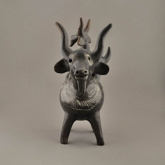 Figurilla de cerámica con forma de chivo con chivo pequeño sobre su lomo orientado transversalmente. Cachos, orejas, barbilla y cola pronunciados. Orificios a modo de ojos y nariz, ranura como boca. Superficie negra bruñida. Decoración incisa con pasta blanca.