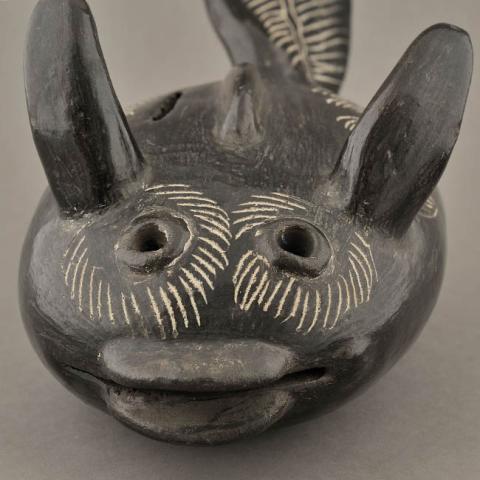 Objeto de cerámica de cuerpo lentiforme alargado con ranura superior a modo de alcancía. Con forma de pez , tiene cola ondulante y aletas superiores pronunciadas. Orificios como ojos. Superficie negra pulida. Decoración incisa con pasta blanca.