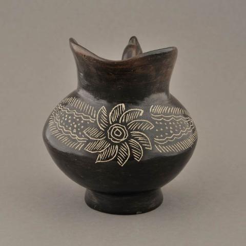 Ceramio de cuerpo lentiforme y base de pedestal. Un asa en el cuerpo con protuberancia en la parte superior. Borde alto en la boca como vertedero. Superficie negra bruñida. Decoración incisa con pasta blanca.