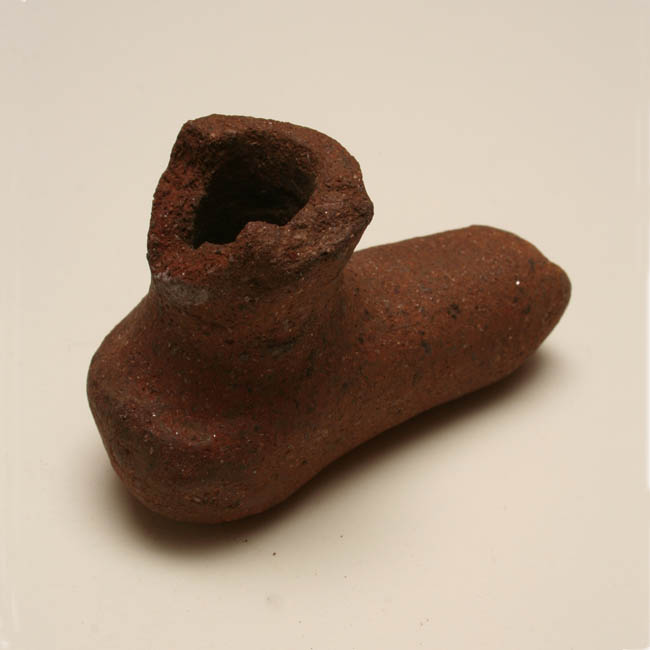 Objeto de uso personal. De foma oblonga. En un extremo hornillo cilíndrico en sobre relieve. En el extremo opuesto orificio hacia el interior a modo de boquilla. Superficie color café, levemente rugosa sin decoración.