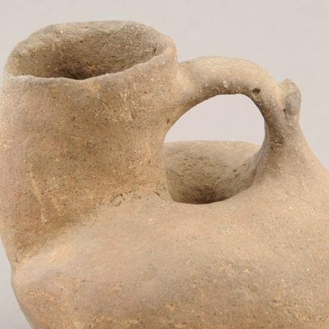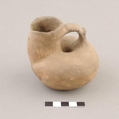 Objeto de uso ceremonial. Contenedor de cuerpo globular con orificio central. En la parte superior del cuerpo, cuello cilíndrico de borde irregular y boca restringida. Base plana restringida. Lleva un asa cinta entre el cuello y el cuerpo. Superficie alisada sin decoración.