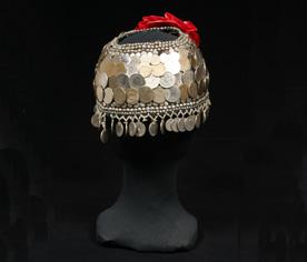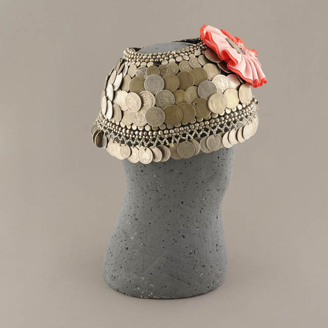 Adorno cefálico de uso personal femenino de forma hemisférica compuesto por cuatro hileras de monedas, rematadas en la parte superior e inferior por corridas regulares de cupulitas ordenadas horizontalmente de mayor a menor tamaño. De la parte inferior pende una corrida de adornos discoidales y en el sector central superior se observa una roseta de tela de colores rosa y rojo con una moneda en el centro.