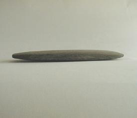 Objeto lítico de forma trapezoidal regular. El borde superior es redondeado y se encuentra perforado; el borde inferior es biselado. Está elaborado en piedra tallada y pulida de color gris.