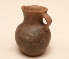 Objeto de uso ceremonial. Contenedor de cuerpo globular. Cuello tronco cónico de borde evertido, labio irregular y boca restringida. Base plana. Lleva un asa cinta entre el cuello y el cuerpo. Superficie pulida y engobada sin decoración.