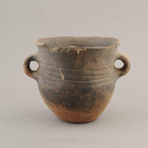 Objeto de uso doméstico. Contenedor de cuerpo globular. Cuello cilíndrico de borde evertido, labio plano y boca abierta. Base plana. Lleva dos asas cinta opuestas en la parte superior del cuerpo. Superficie pulida con líneas paralelas horizontales incisas a la altura de las asas.