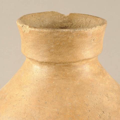 Objeto de uso doméstico. Contenedor de cuerpo globular. Cuello corto en sobre relieve. De forma cilíndrica con el labio plano y la boca restringida. Base apuntada de terminación plana. Superficie pulida y engobada sin decoración.
