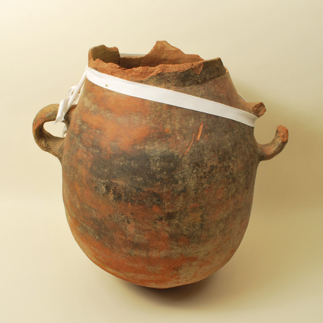 Objeto de uso funerario. Contenedor de cuerpo globular. Cuello corto cilíndrico de labio plano y boca restringida. Base apuntada. Un asa cinta en la parte superior del cuerpo. Opuesta a ella protuberancias correspondientes a asa faltante. Superficie pulida y engobada sin decoración.