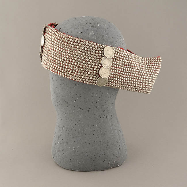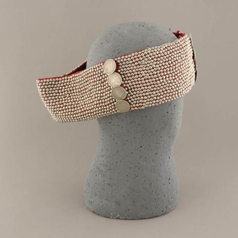 Adorno cefálico de uso personal femenino de forma oblonga compuesto por una banda de textil de color rojo tachonada de veinte filas de cupulitas y tres series de cuatro adornos discoidales en doble fila a cada extremo .