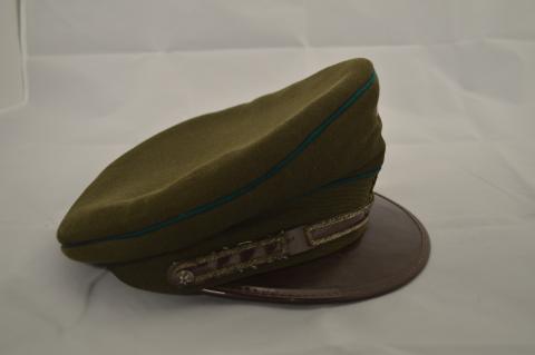 Objeto de uso personal, que sirve para cubrir la cabeza. Cuerpo de color verde oliva, en la parte superior se alza en punta, mientras que la cara frontal posee visera horizontal de color marrón sobre la que tiene cinta también marrón con dorado y en el centro escudo nacional.