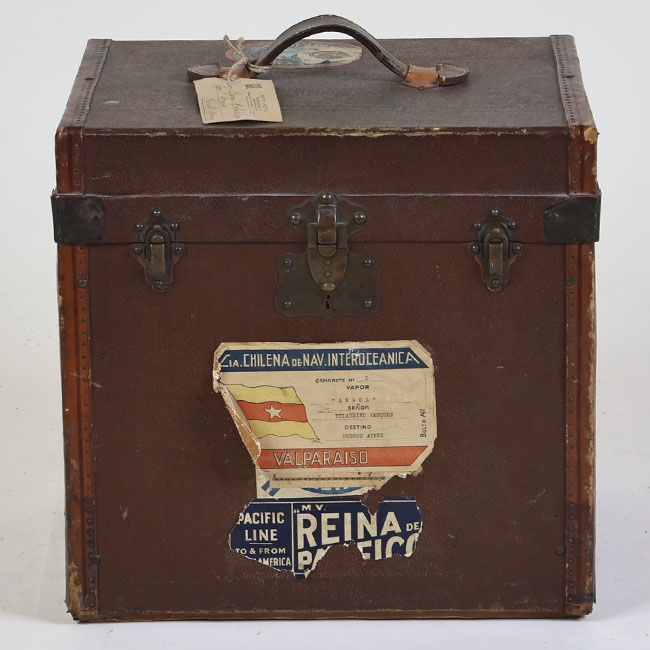 En la valija figuran una serie de etiquetas adhesivas que identifican a sus portadores, navíos, empresas de viaje, hoteles y ciudades.