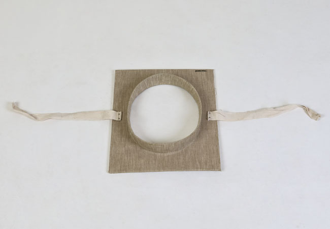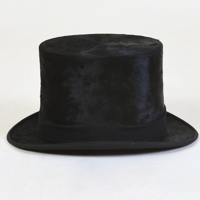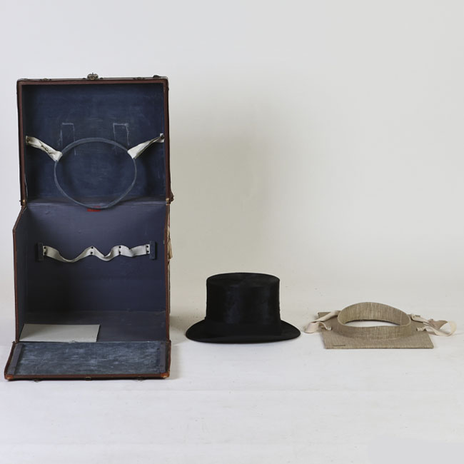 Contenedor rígido revestido en cuero exteriormente con refuerzos de doble cuero en los borde y esquinas metálicas en la línea de refuerzo para los cerrojos. Con abertura superior y cara frontal abatible. Interiormente revestida de tela y terciopelo gris, con soportes removibles para la fijación y seguridad del sombrero.