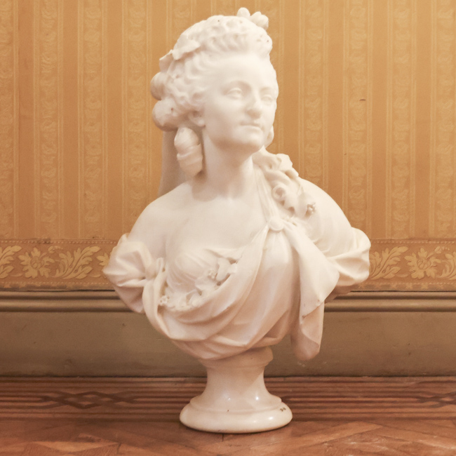 Obra exenta. Busto de figura femenina de cabello rizado, tiene la cabeza girada hacia la izquierda y levemente levantada, lleva vestido con pliegues y recogido en el hombro izquierdo, descansa sobre un pedestal circular de mármol. Exhibida sobre una columna de madera.