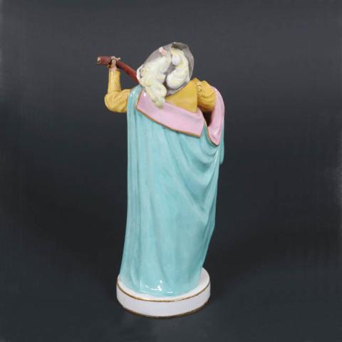 Obra exenta policromada de una figura antropomorfa masculina de pie sobre base circular de color blanco. Postura de la cabeza hacia atrás, sosteniendo con ambas extremidades superiores un instrumento musical de cuerdas. Postura, pie derecho adelantado y el izquierdo queda cubierto por la capa de su vestimenta que llega esta el suelo. Lleva sombrero de ala ancha decorado con plumas, cuello de color blanco, camisa de amarilla con cinturón negro. Capa celeste con forro rosado, pantalón marrón y botas. Porta una espada en la cintura.