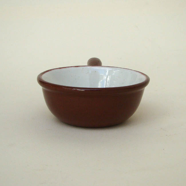 Recipiente globular de cerámica cóncavo, su extremo superior es de boca ancha, de base circular y plana, de la base nacen paredes lisas que van aumentando su circunferencia a medida que van hacia el extremo superior, de color cafe en su exterior y de interior color blanco. Desde una de sus paredes exteriores nace un mango.