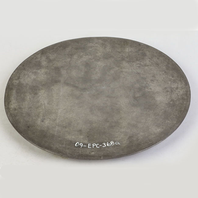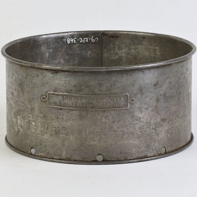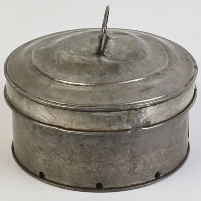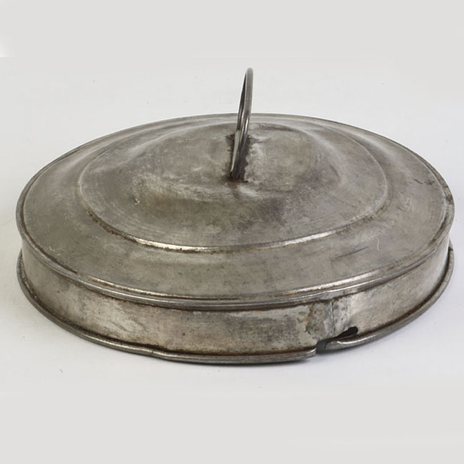 Recipiente metálico de forma cilíndrica, ligeramente cónico hacia su base. Posee una tapa removible con un asa en forma de arco ubicada en el centro superior. De la base nacen paredes lisas que forman un contorno.