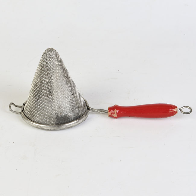 Objeto metálico de forma cónica, la parte superior de diámetro mayor que la parte inferior. Las paredes tienen una malla metálica con orificios dispuestos uniformemente; en el borde y al acostado un tomador alargado de metal con un orificio al extremo opuesto.
