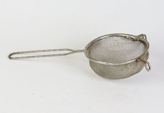 Utensilio compuesto por un cuerpo semi circular de malla metálica fina, sostenida por un aro metálico rígido. Posee un mango alargado de alambre metálico curvado. En el lado opuesto al mango, incluye un soporte curvo, también metálico que ayuda al equilibrio.