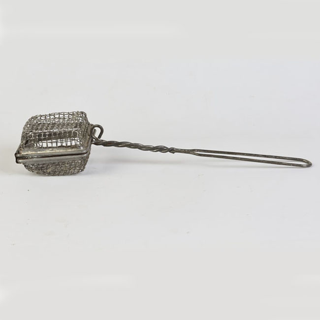 Objeto compuesto por una estructura metálica elaborada con alambre. Presenta una canastilla de forma rectangular abatible, tejida con malla de alambre y unida con un mango largo, también de alambre, trenzado en parte de su extensión y con un extremo doblado en forma de lazo.
