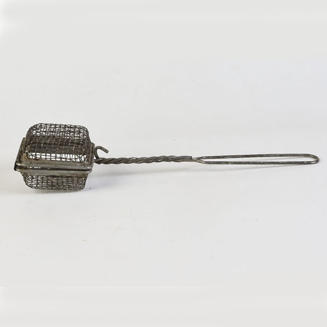 Objeto compuesto por una estructura metálica elaborada con alambre. Presenta una canastilla de forma rectangular abatible, tejida con malla de alambre y unida con un mango largo, también de alambre, trenzado en parte de su extensión y con un extremo doblado en forma de lazo.