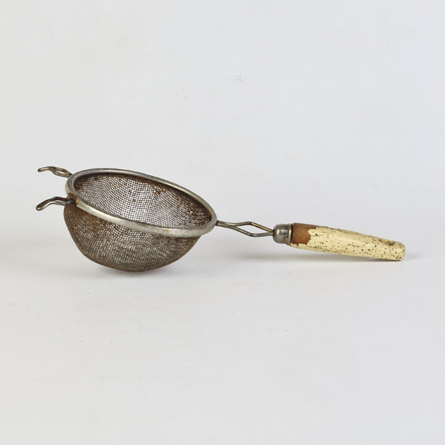 Filtro, en forma semi esférica con malla metálica, en el borde superior tiene dos puntas alargadas y en el mismo borde se extiende un mango lineal de madera.