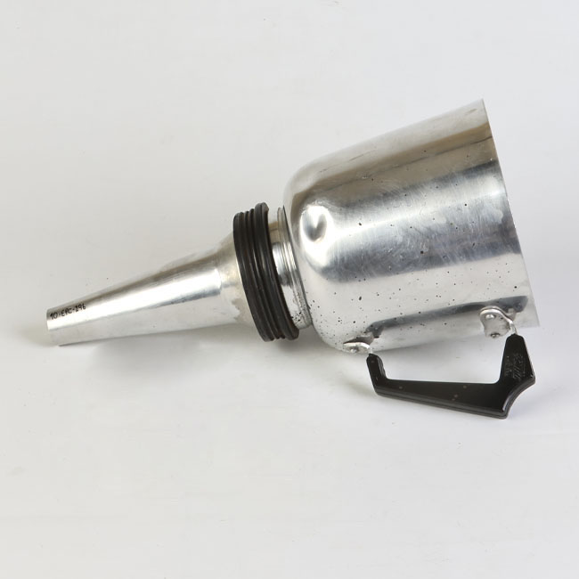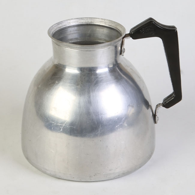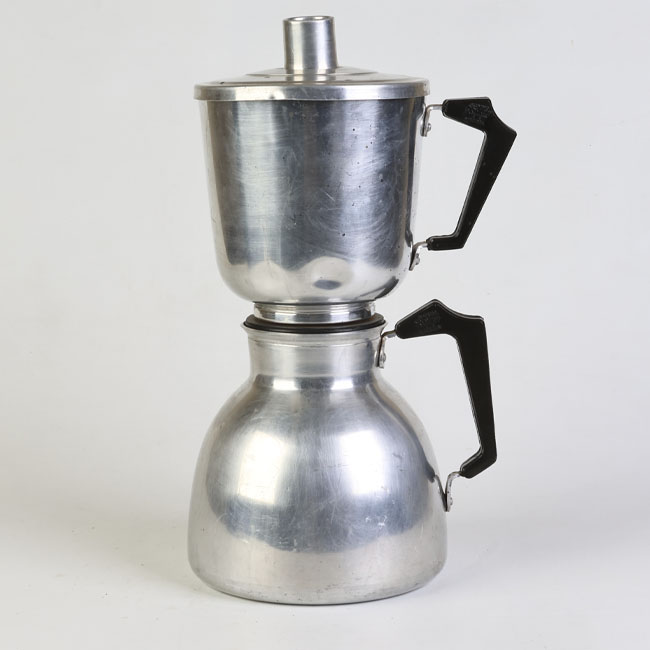 Objeto de dos cuerpos metálicos apilados verticalmente, ambos con superficie plateada. El inferior es más ancho y redondeado; el superior, cilíndrico, tiene tapa con pico corto y ambos poseen mangos negros angulares.