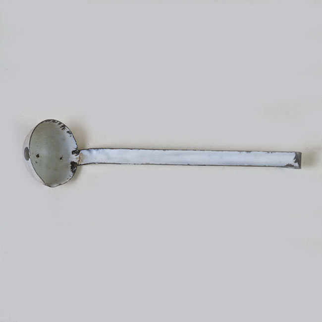 Recipiente metálico, con sección cóncava y circular para tomar líquidos y otra sección que corresponde a un mango, de forma plana que se ensancha y toma una pequeña curvatura hacia el extremo.