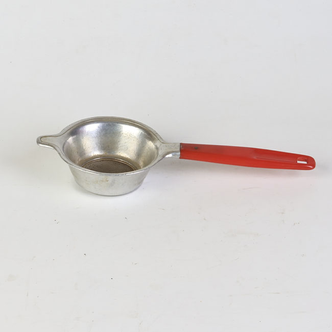 Utensilio domestico, de cuerpo metálico y circular de boca ancha, en la base tiene una malla de perforaciones uniformes. De la superficie superior nace un mango color rojo, y al extremo opuesto posee una pestaña que ayuda al equilibrio.