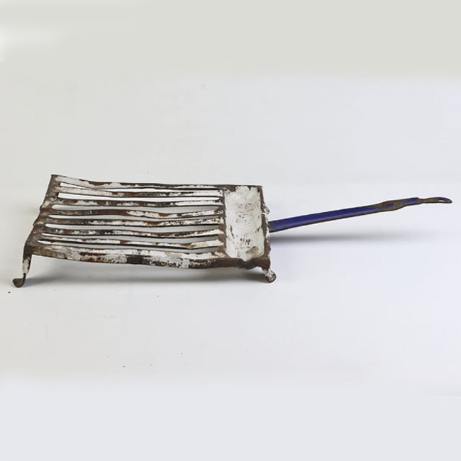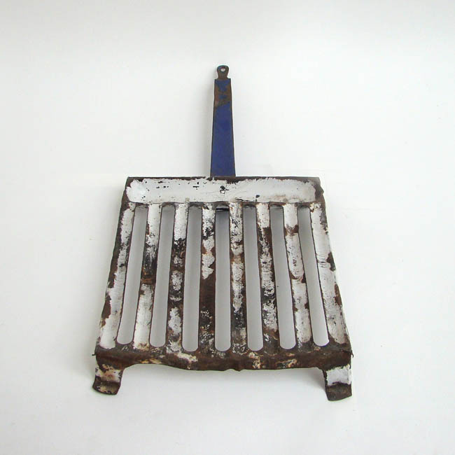 Utensilio metálico, de uso domestico. De cuerpo cuadrado, con base; de superficie acanalada en hileras paralelas. Desde la base nace un mango color azul, con un orificio en el extremo más alejado a la base.