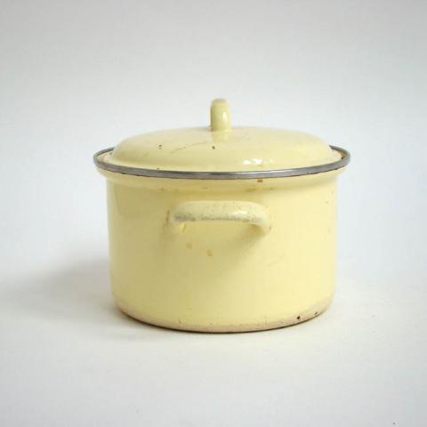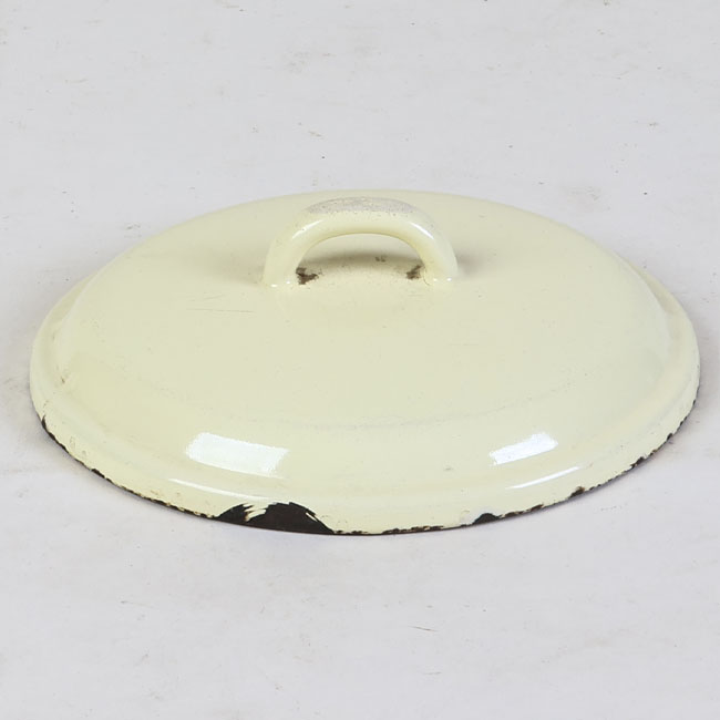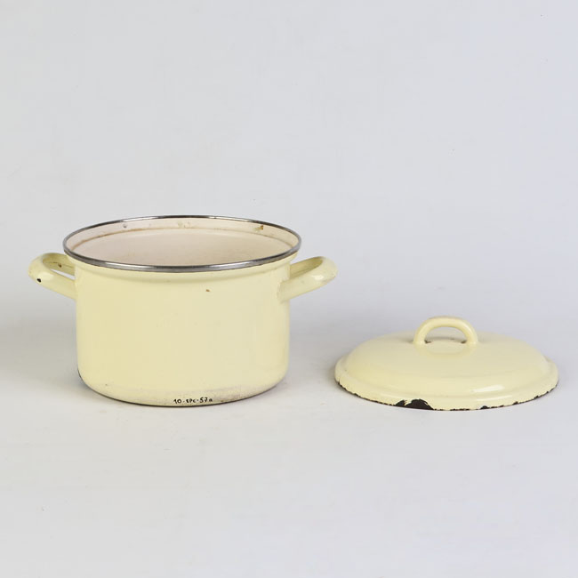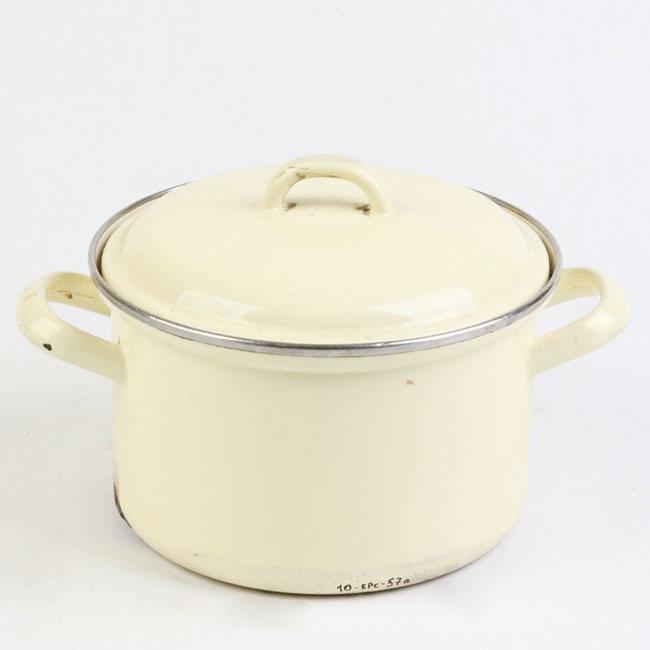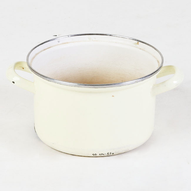 Recipiente metálico de forma circular, de base plana y boca ancha. Posee una tapa removible, con un asa al centro. De la base nacen paredes lisas que forman un contorno.