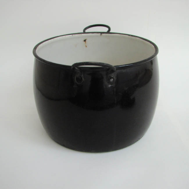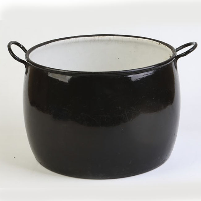 Recipiente metálico de forma circular, color negro, de base plana y boca ancha. Posee una tapa removible, con un asa al centro. De la base nacen paredes lisas que forman un contorno. En las paredes externas tiene dos asas opuestas y un tomador curvo y largo unido a ellas.