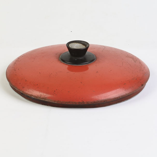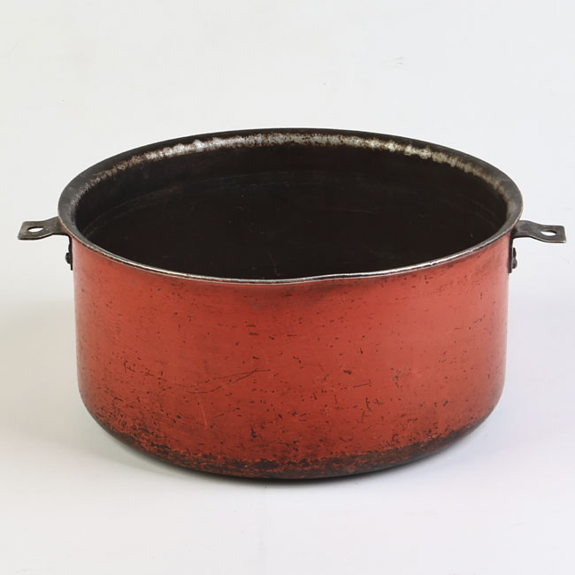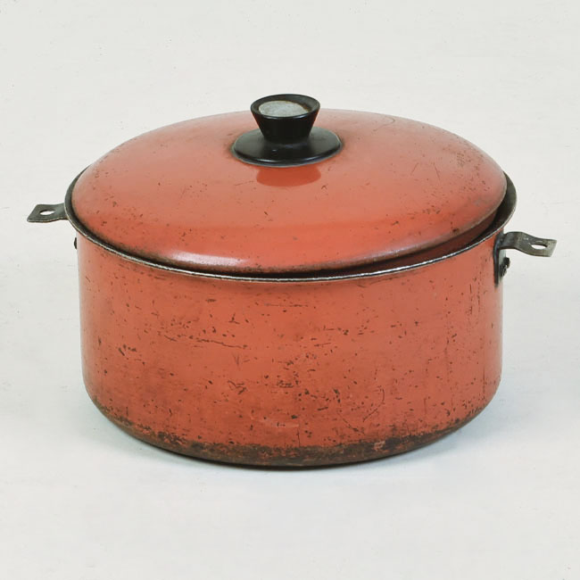 Recipiente metálico de forma circular, de base plana y boca ancha. Posee una tapa removible, con un asa al centro. De la base nacen paredes lisas que forman un contorno. Desde las paredes externas nacen dos asas cuadradas y cortas, con una perforación circular al centro.