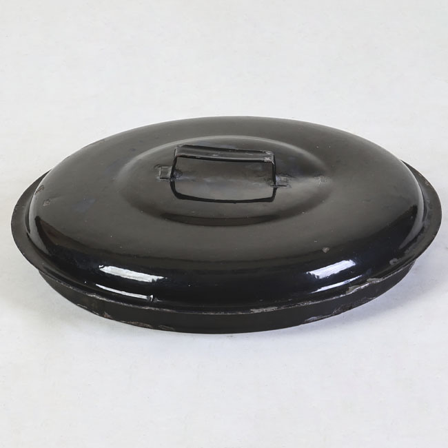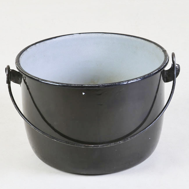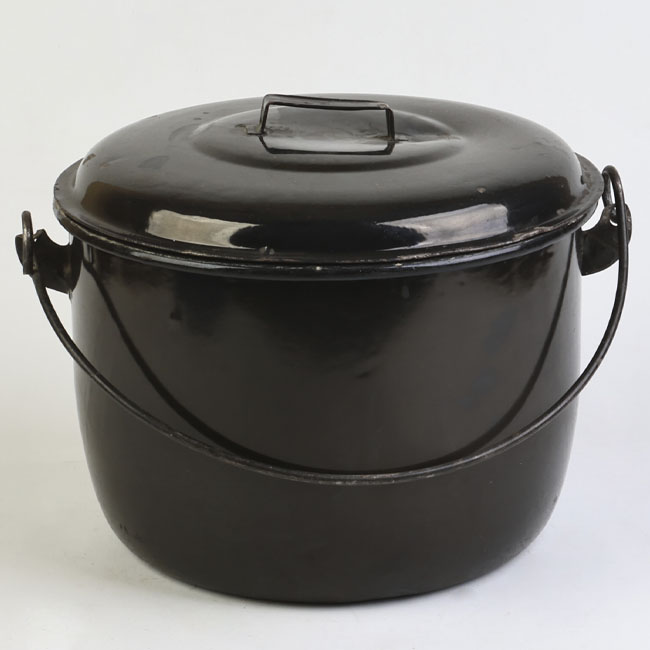Recipiente metálico de forma circular, color negro, de base plana y boca ancha. Posee una tapa removible, con un asa al centro. De la base nacen paredes lisas que forman un contorno. En las paredes externas tiene dos asas opuestas y un tomador curvo y largo unido a ellas.