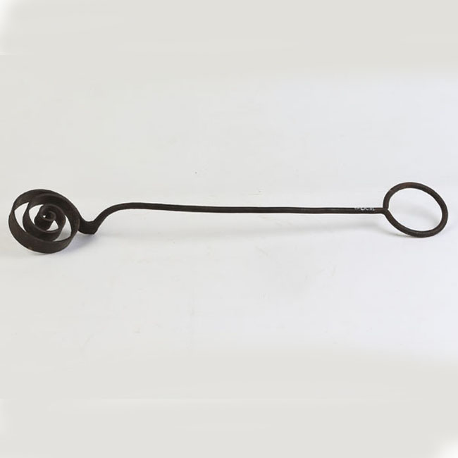Objeto alargado de color negro, compuesto por una barra recta con una forma circular en un extremo y una espiral plana en el otro, ambos en el mismo plano.