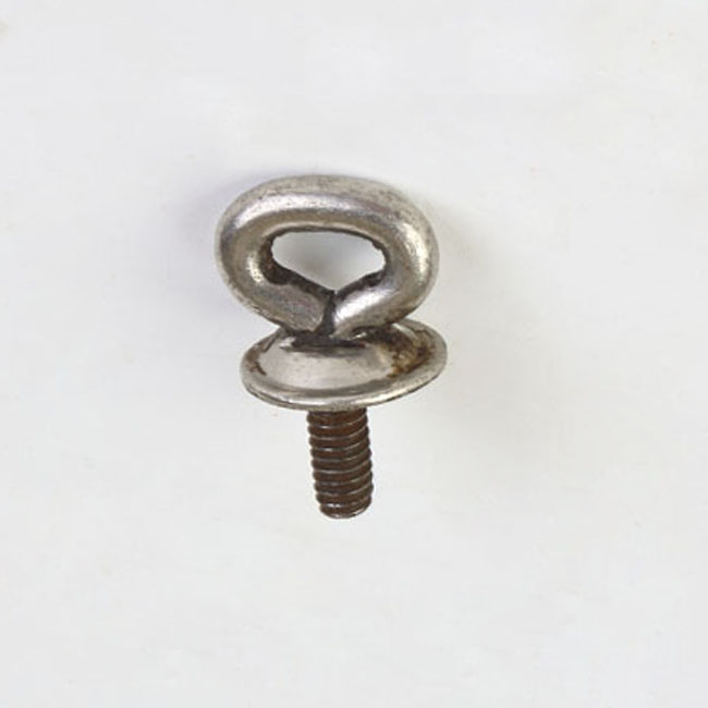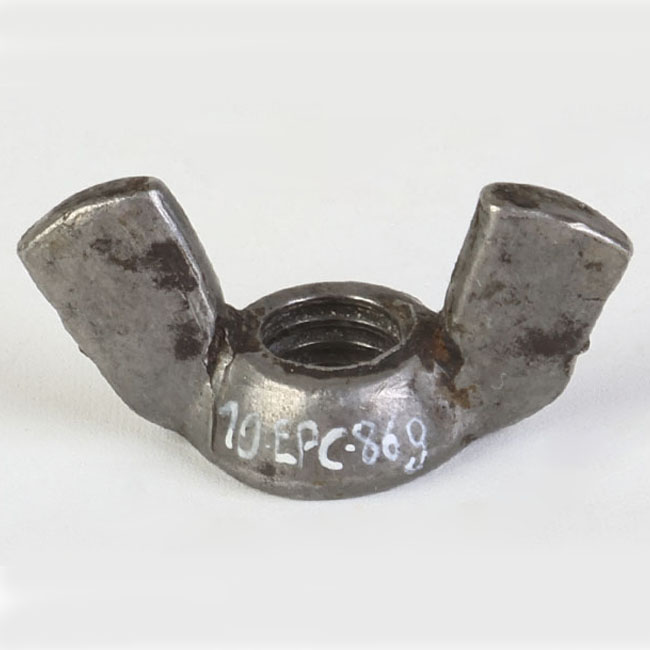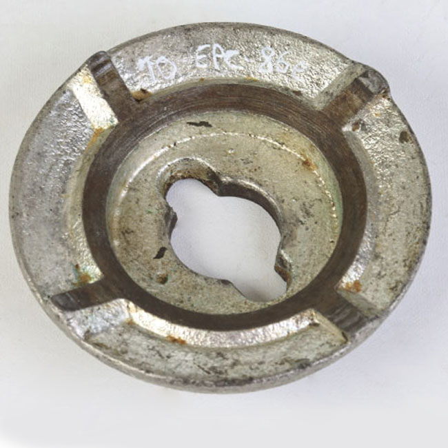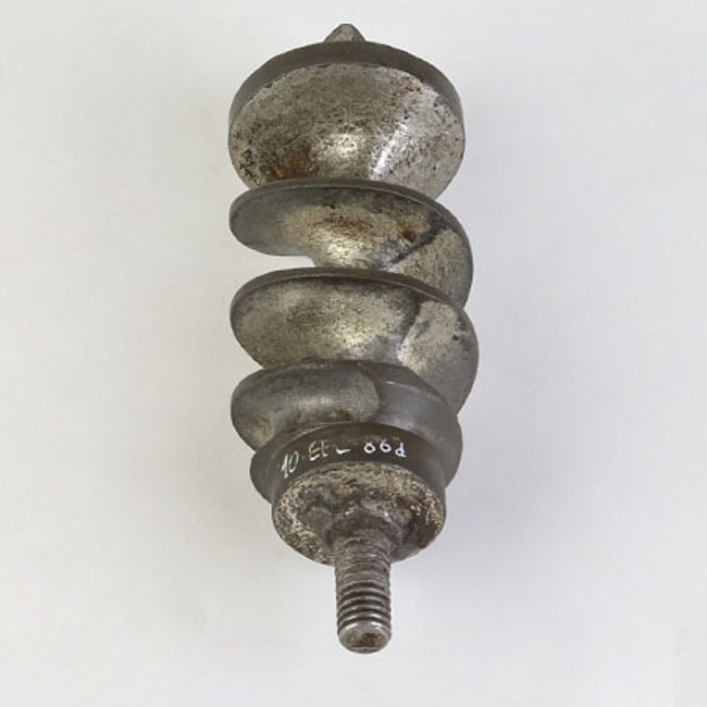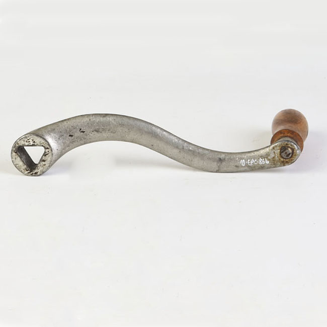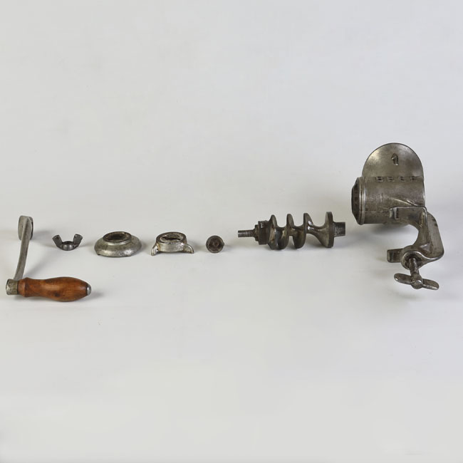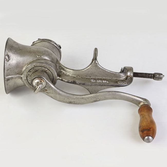 Objeto de uso doméstico de forma irregular compuesto por un cuerpo que tiene en la parte superior un receptáculo evertido con un brazo horizontal cribado y una base en C con tornillo para fijarlo a una superficie. En el sector proximal tiene una manivela en L que se gira para accionarlo.