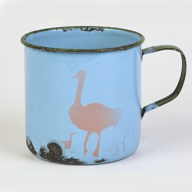 Recipiente enlozado de forma tubular, con asa en uno de sus lados. El borde superior está pintado de color verde y tiene un dibujo de ave en su pared exterior.