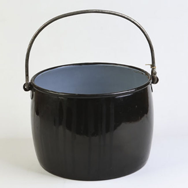 Recipiente metálico de forma circular, color negro, de base plana y boca ancha. Posee una tapa removible, con un asa al centro. De la base nacen paredes lisas que forman un contorno. En las paredes externas tiene dos asas opuestas y un tomador curvo y largo unido a ellas.