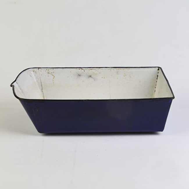 Molde de cocina rectangular y metálico, de color azul por fuera y blanco en su interior. Presenta paredes rectas, que se elevan desde una base plana, formando un contorno, la superficie interior es lisa. En un extremo exterior posee un asa desplegable.