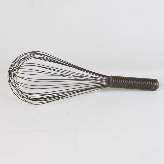 Utensilio de uso domestico; metálico, compuesto por múltiples alambres curvos unidos en la base, formando una estructura ovalada; tiene un mango cilíndrico envuelto en alambre.