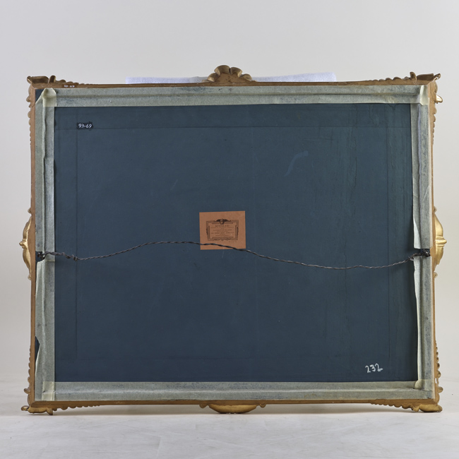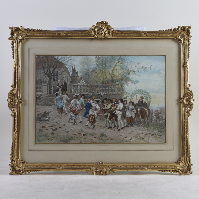 Obra de formato rectangular. Composición en basada en un grupo de personas bailando, vestidos al estilo del siglo XVIII. En segundo plano una escalera y un balcón con balaustradas, a la derecha una carreta con bueyes. Obra inscrita dentro de un paspartu, marco dorado de estilo neo rococó.