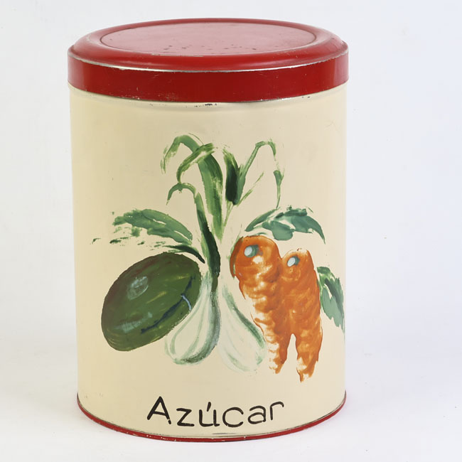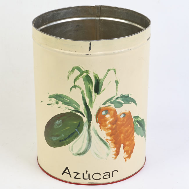 Contenedor metálico, de uso domestico, con cuerpo cilíndrico, cóncavo y de base plana, desde la base se levantan paredes lisas que crean un contorno. en la parte superior posee una tapadera circular metálica