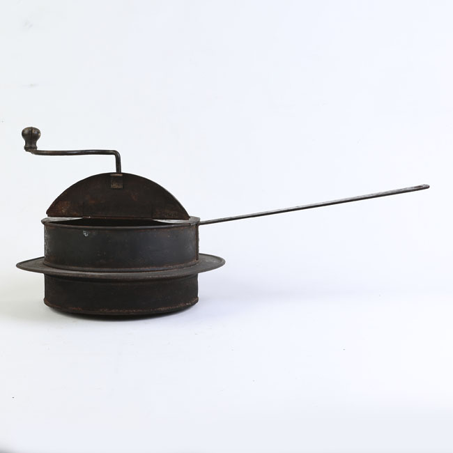 Utensilio de uso domestico, de cuerpo cilíndrico, con una tapa superior, manivela con pomo en la parte superior y un mango largo horizontal. Color oscuro y superficie opaca.