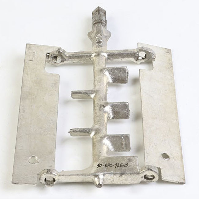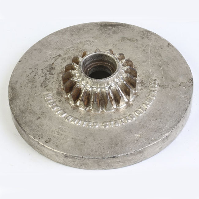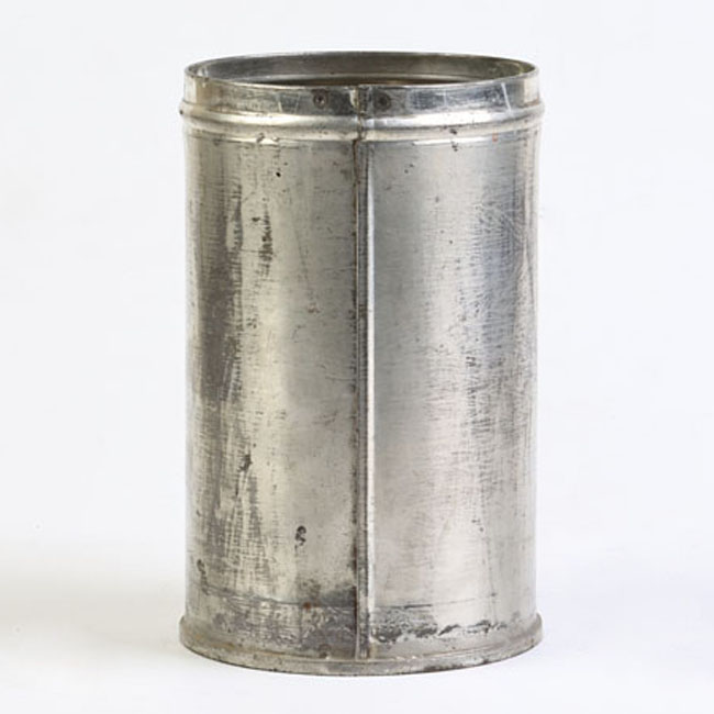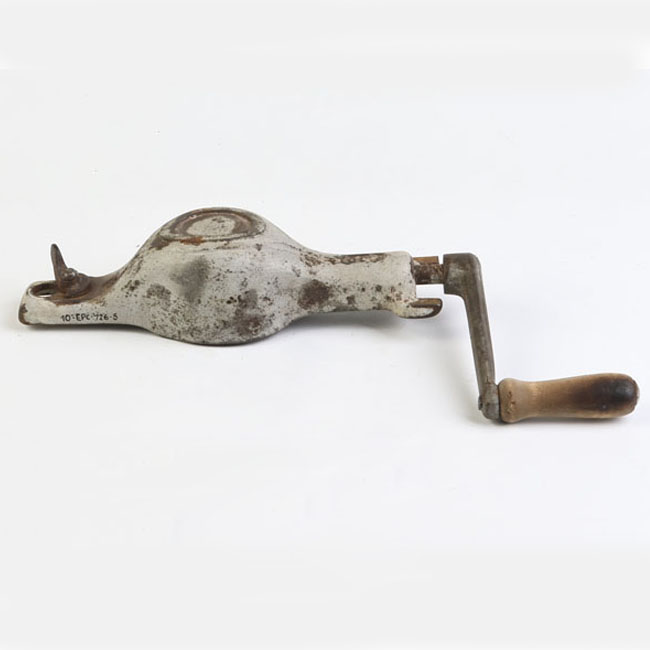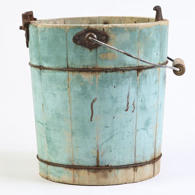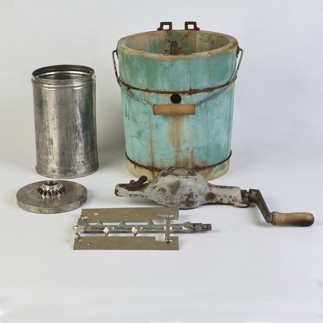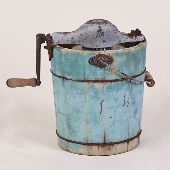 Cilindro de madera azulado; con refuerzos metálicos. Posee un engranaje superior, manivela lateral con un mango de madera y asa de alambre en un costado.