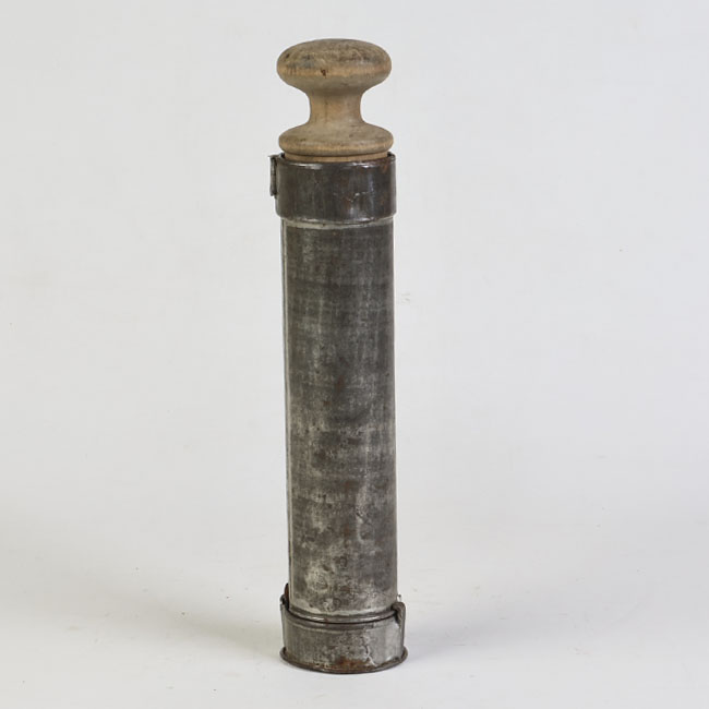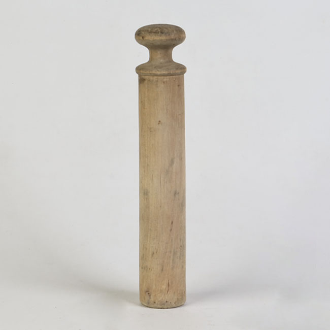Utensilio domestico, compuesto por dos cuerpos cilíndricos; uno de ellos de metal y de un diámetro mayor, el segundo de ellos está hecho de madera y posee un tomador redondeado en el extremo superior.