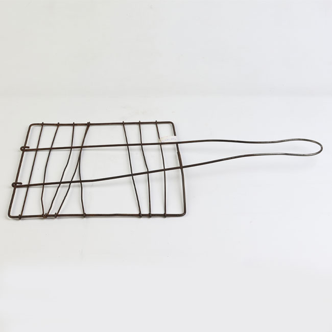 Herramienta de uso domestico, metálica, color negro. Su estructura es cuadrada; posee ocho hileras paralelas de alambre sujetas a la base, desde un extremo de la base nace un mango, también de alambre.