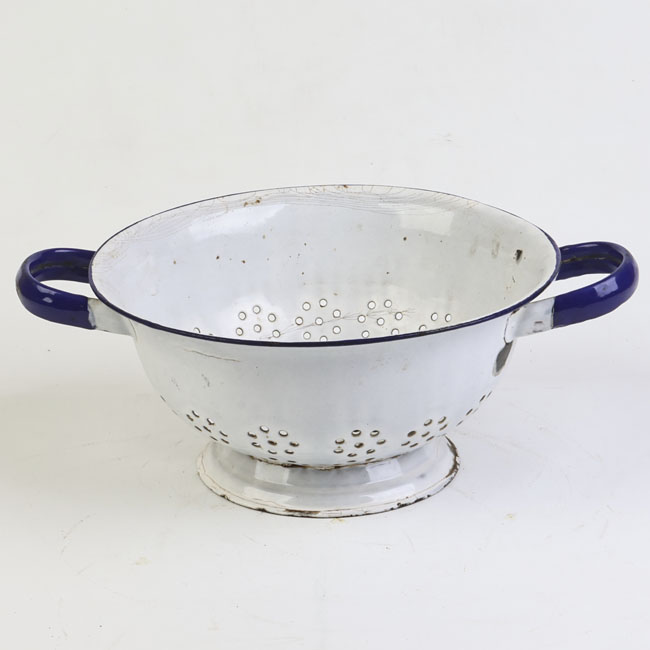Recipiente enlozado, de forma circular y cóncavo, con perforaciones regulares que se repiten en sus paredes y fondo. En la parte exterior, en dos extremos opuestos del recipiente se extienden asas curvas.