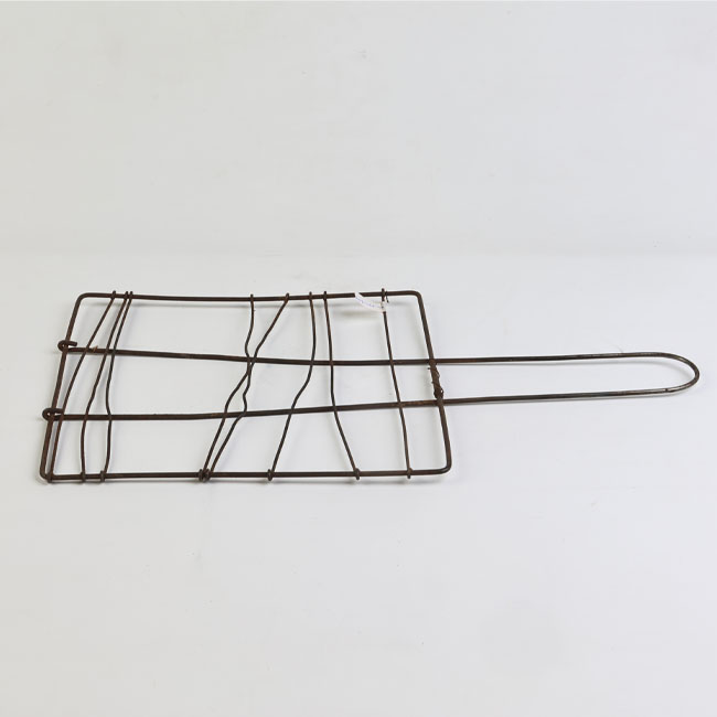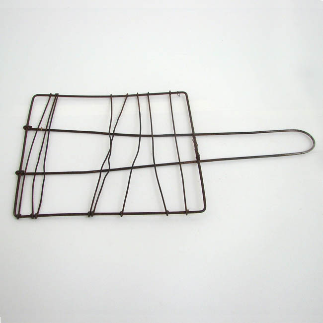 Herramienta de uso domestico, metálica, color negro. Su estructura es cuadrada; posee ocho hileras paralelas de alambre sujetas a la base, desde un extremo de la base nace un mango, también de alambre.