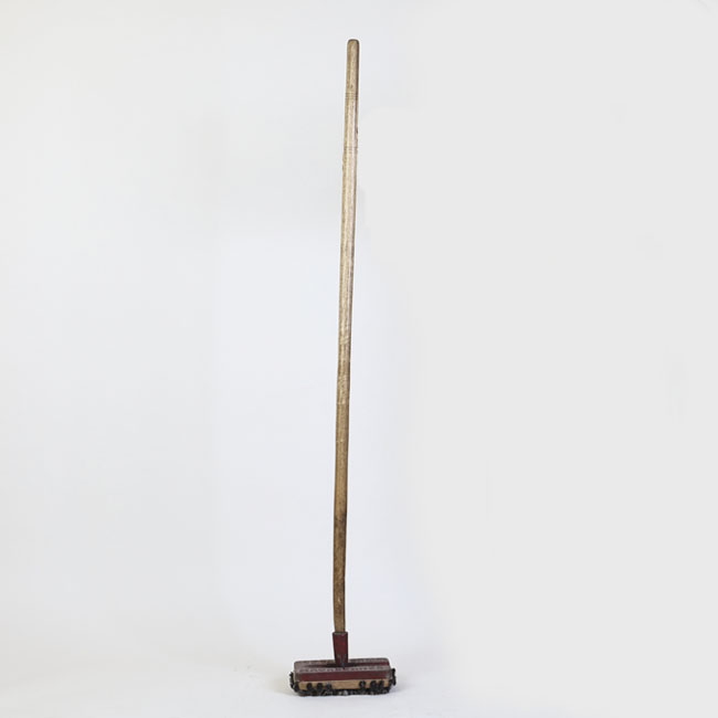 Objeto de uso doméstico compuesto de una base metálica rectangular de metal que sirve de peso para el cepillo con cerdas en las caras y bordes visibles. La base se une a soporte del mismo material en el que se inserta un cilindro de madera que permite la manipulación.