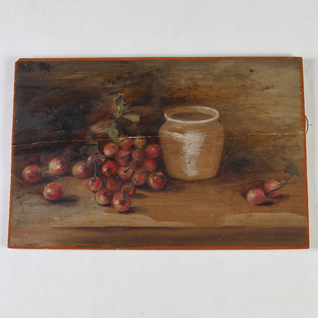 Obra visual, donde se puede observar el dibujo de un cuerpo cilíndrico de boca ancha, sobre una superficie donde también se observan frutos redondos.