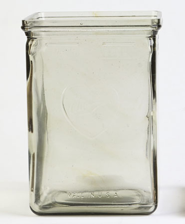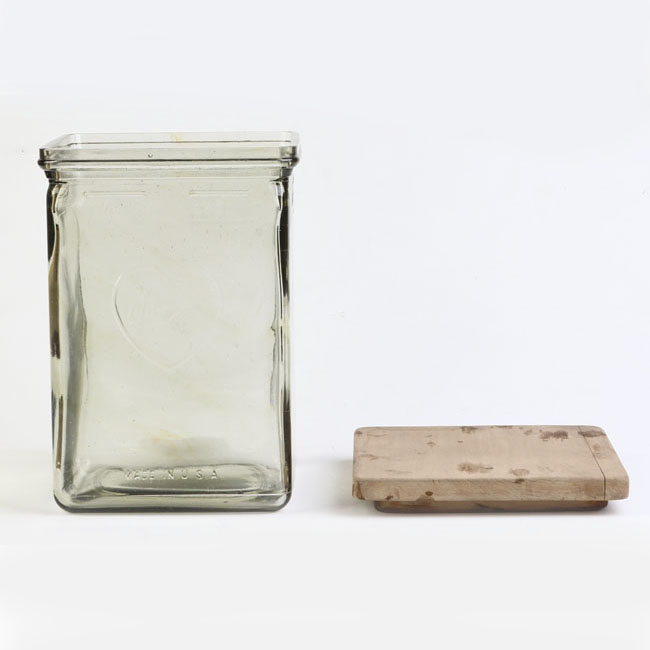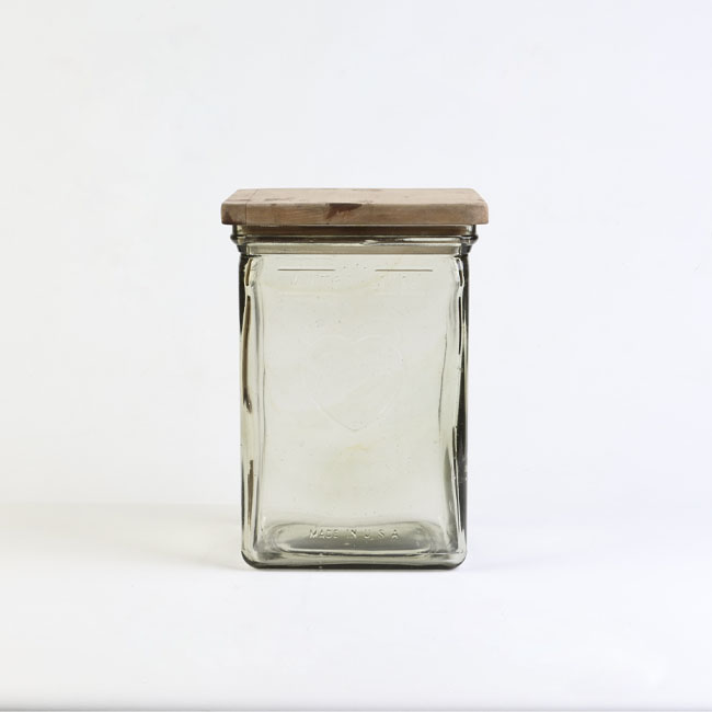 Recipiente transparente, de vidrio de cuerpo rectangular y disposición vertical, de base plana y paredes lisas. Tapa superior cuadrada de color madera, lisa.