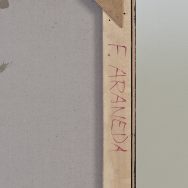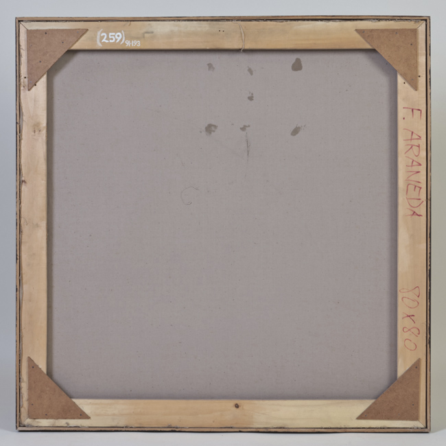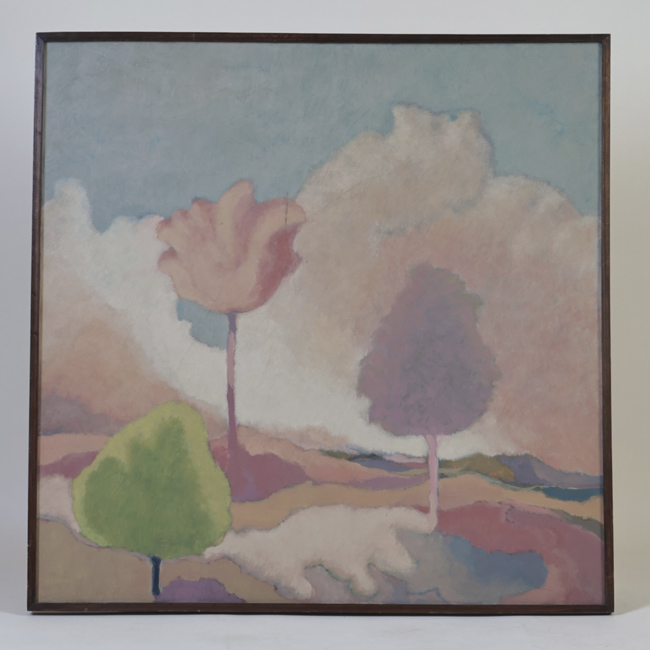 Obra bidimensional de formato cuadrado. Paisaje en tonos rosas, con tres árboles y de fondo nubes en la base dejando a la vista el cielo en la parte superior. Marco de madera pintado color café.